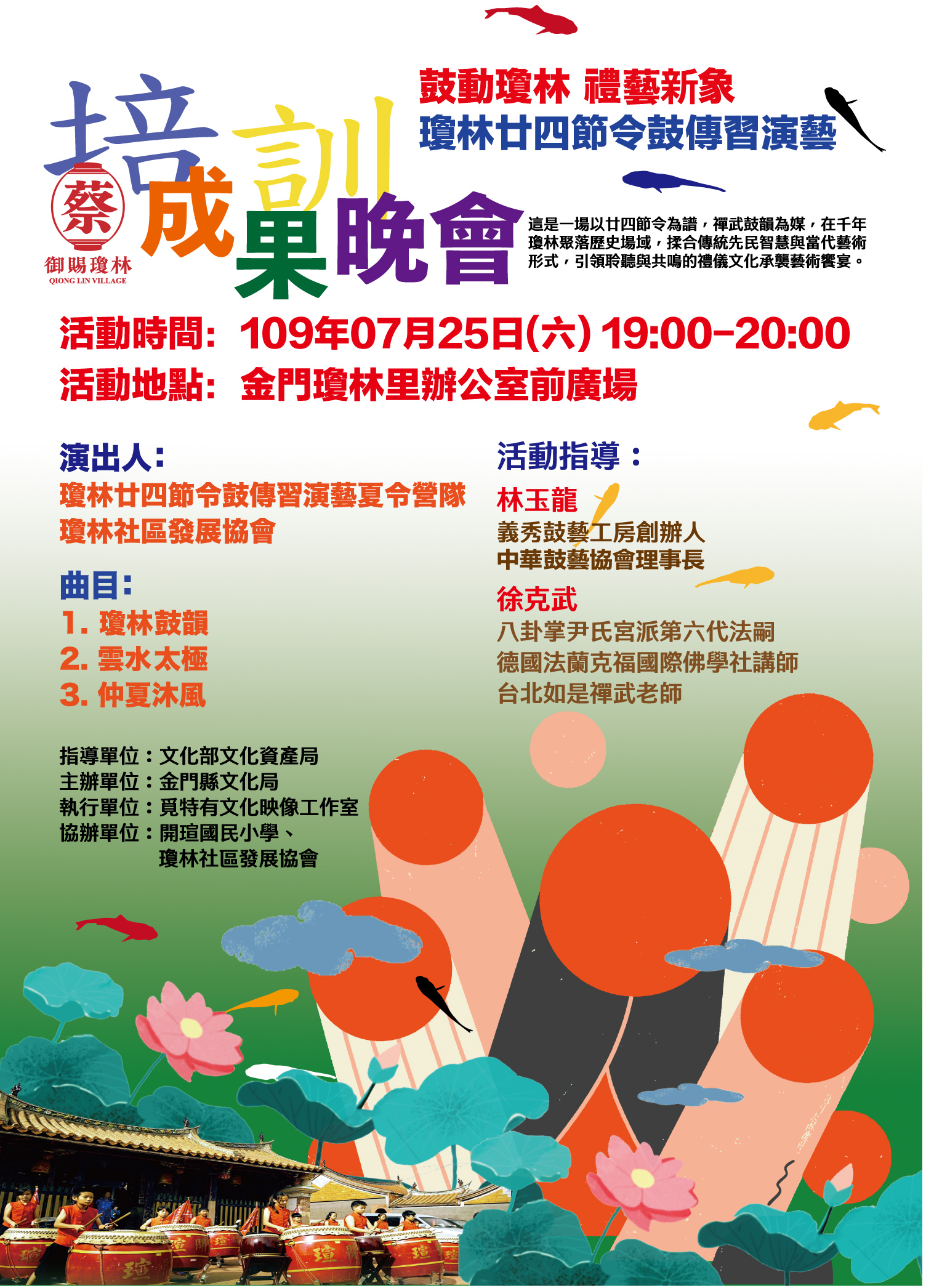 金門縣文化局委託覓特有文化映像工作室執行「金門縣瓊林再造歷史現場文化創意產業輔導發展計畫(第三期)」案,規劃於7月21至25日辦理「鼓動瓊林、禮藝新象」瓊林廿四節令鼓傳習演藝營隊培訓工作,以結合年青世代參與聚落文化藝術與觀光行銷發展,並將於7月25日(週六)晚間7點假瓊林里辦公處前廣場,舉辦一場揉合傳統先民智慧與當代藝術形式的24節令鼓夏令營培訓成果發表晚會,歡迎在地鄉親踴躍前往觀賞。